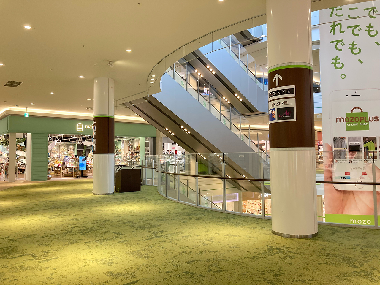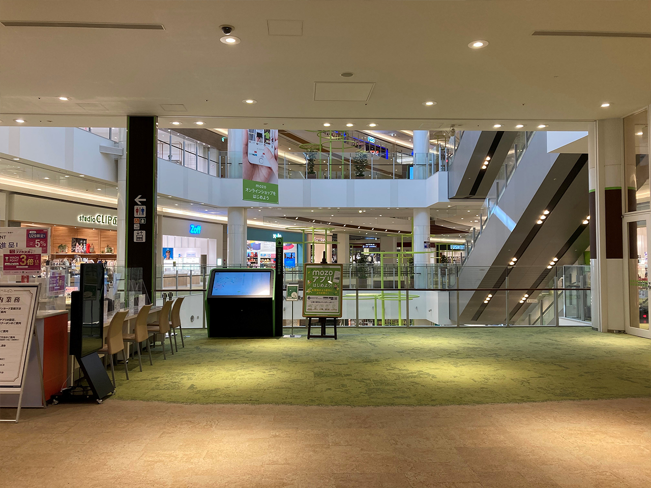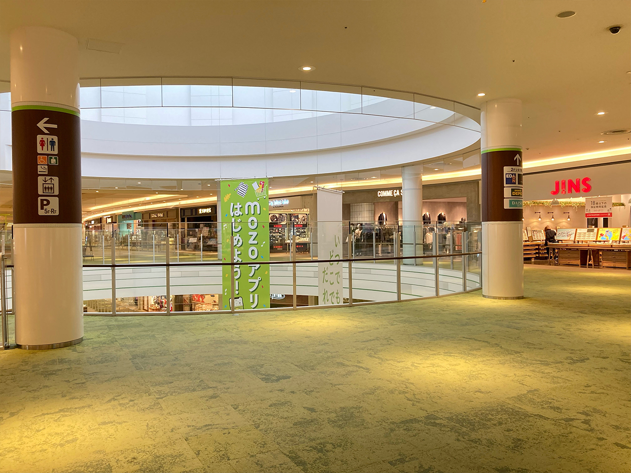 専門店とイオンスタイルの横に位置し、mozoフードマルシェが近くにあります。 コート内にはmozoのシンボルであるmozoツリーが備わる、吹き抜けの解放感のあるイベントスペースです。