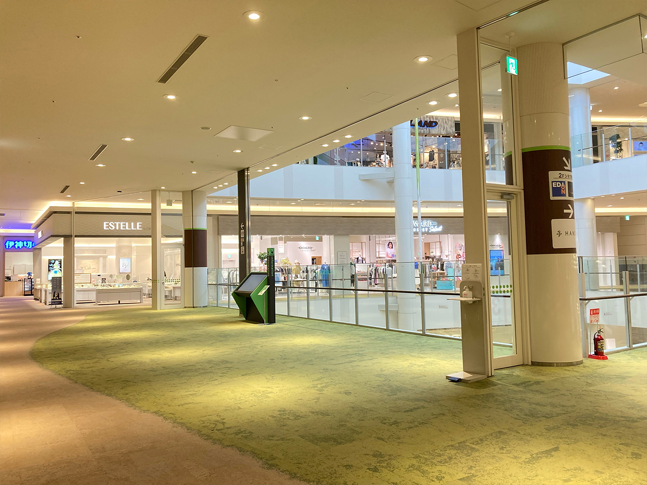専門店とイオンスタイルの境に位置し、アパレルショップを集積したフロアにあるイベントスペース。常設のイオンカードカウンターの横がイベントスペースとなります。