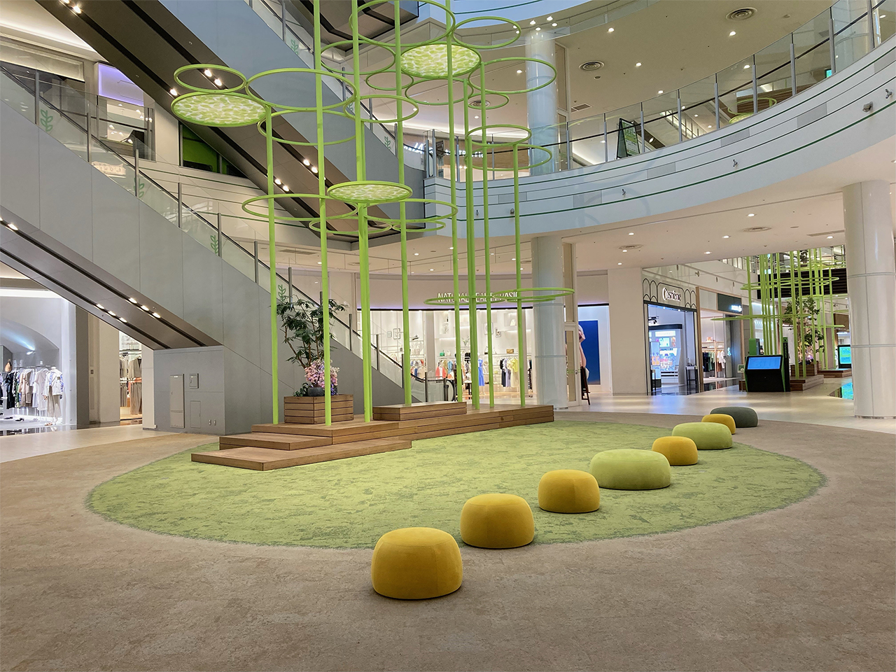 周囲にはZARA、アクタスがあり、コート内にはmozoのシンボルであるmozoツリーが備わる、吹き抜けの解放感のあるイベントスペースです。